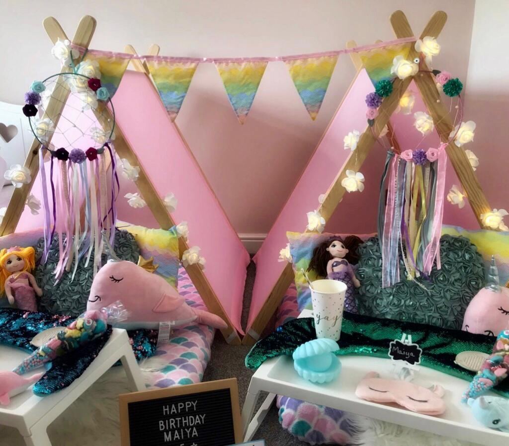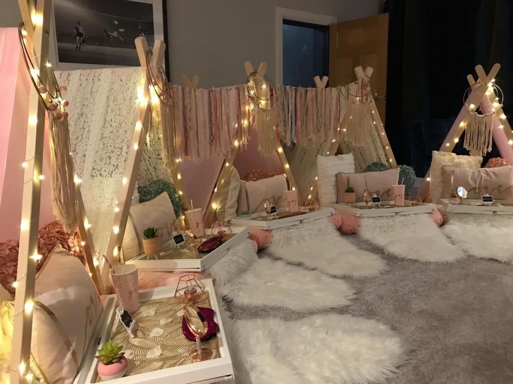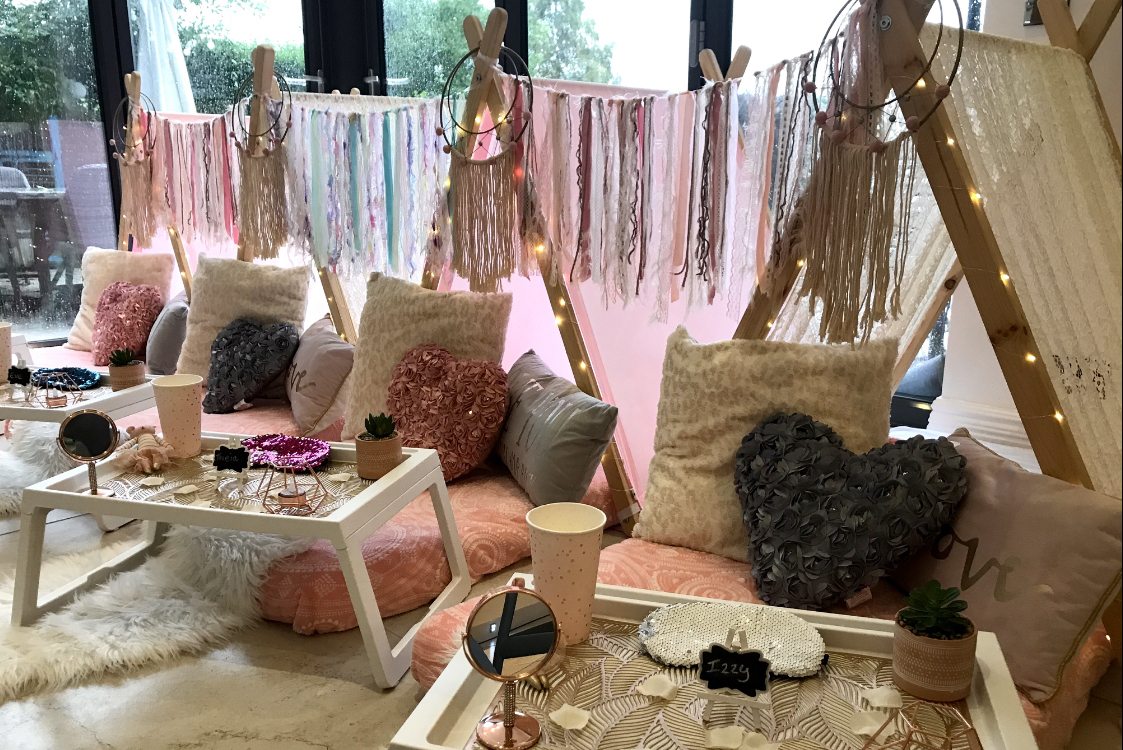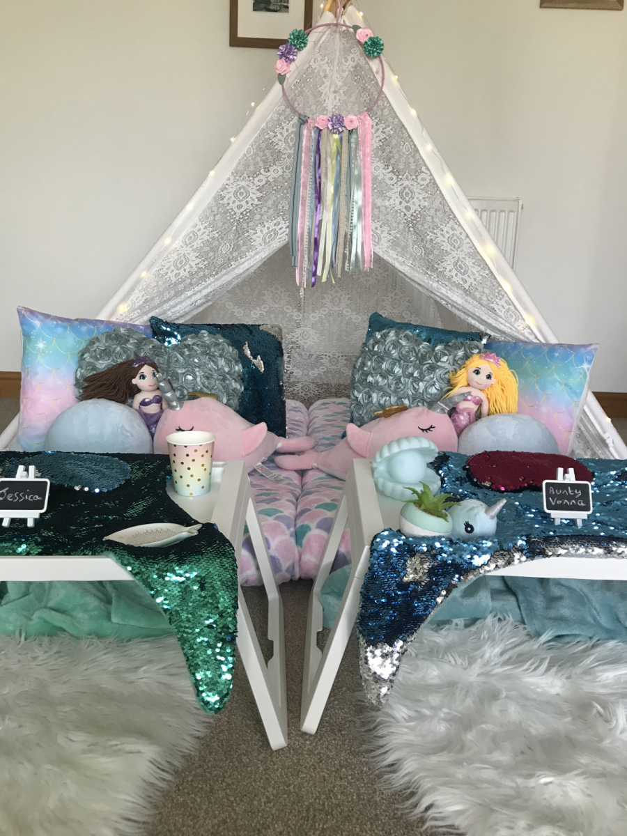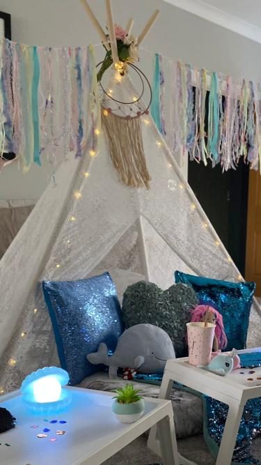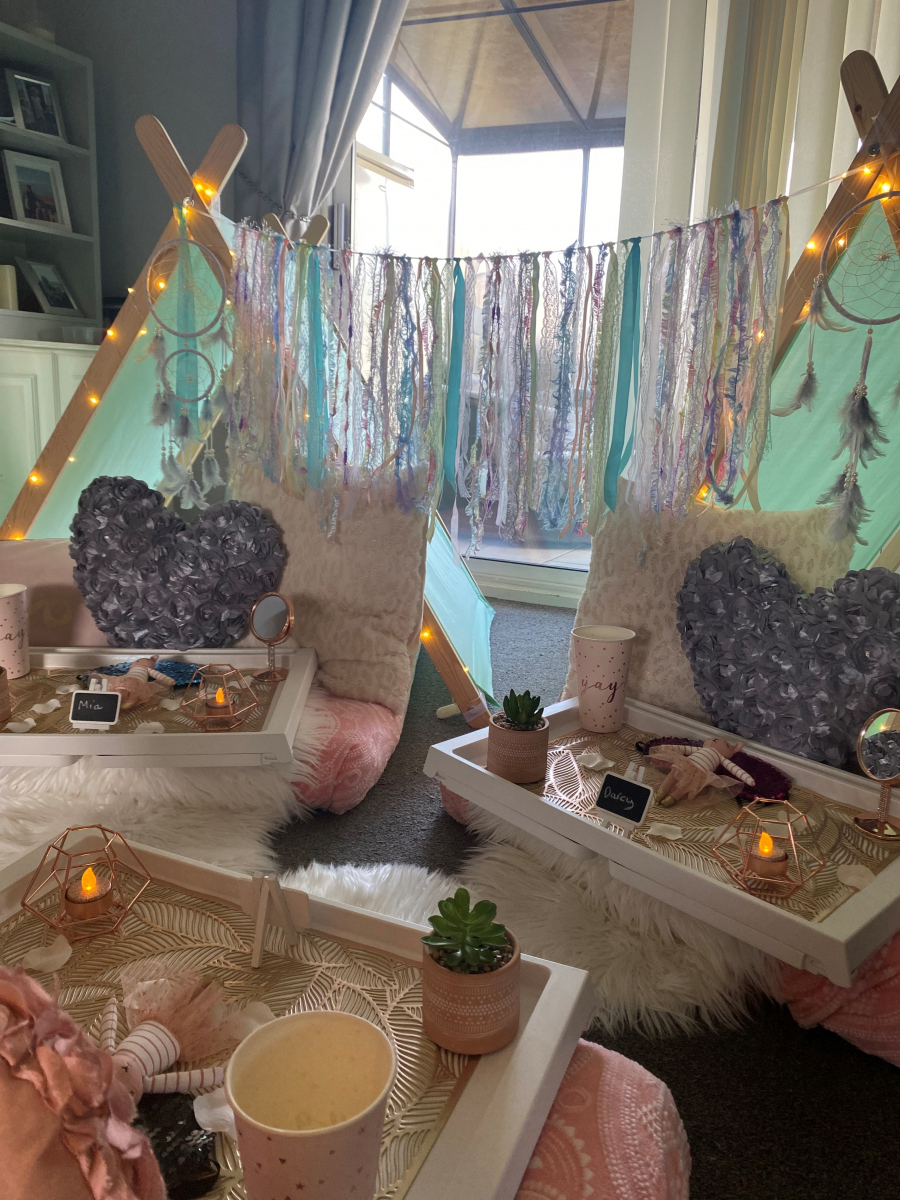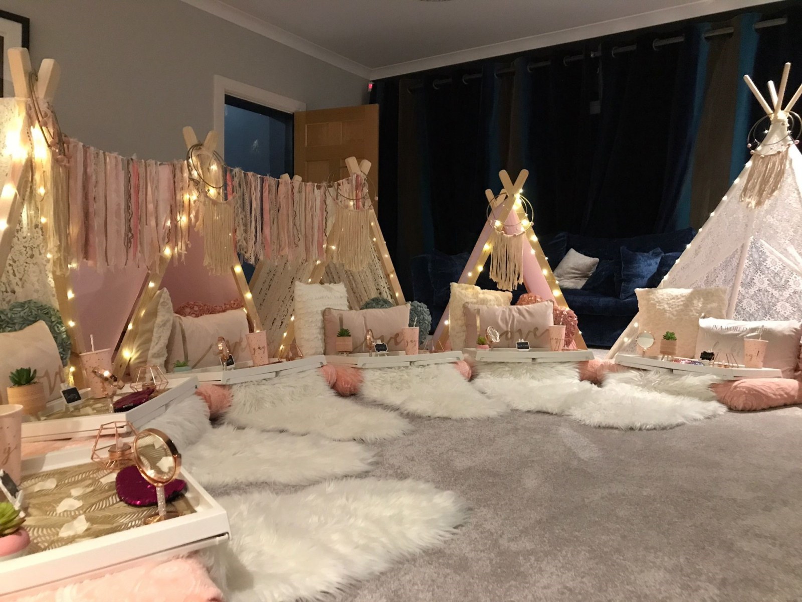 On this page you will find a selection of photos from some of our magical slumber party set-ups (The Grand Deluxe Double Lace Teepee; Tropical Flamingo; Game On!; Soccer Slumber; Glitz and Glamour; Movie Magic; Roarsome Dinosaurs; Treasures of the Sea; Ocean Adventures; Christmas Candy Cane; The Spa at Sleepy Teepee), click on any photograph for a larger image. We have also included a few videos to give you an idea of our magical set-ups. If you cannot see a theme that suits your needs, drop us a message and we will help to design a personal sleepover setup for you. All of our special themes are also available for play dates. Perfect for those who would prefer a party during the day or for children who are not quite old enough for a sleepover.