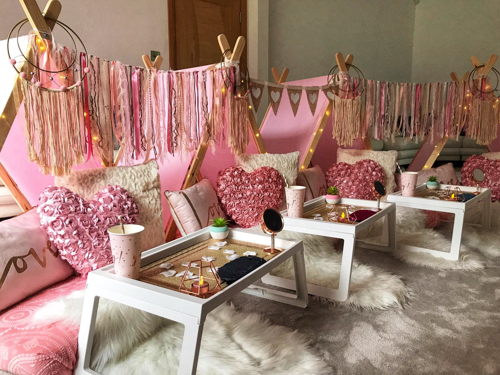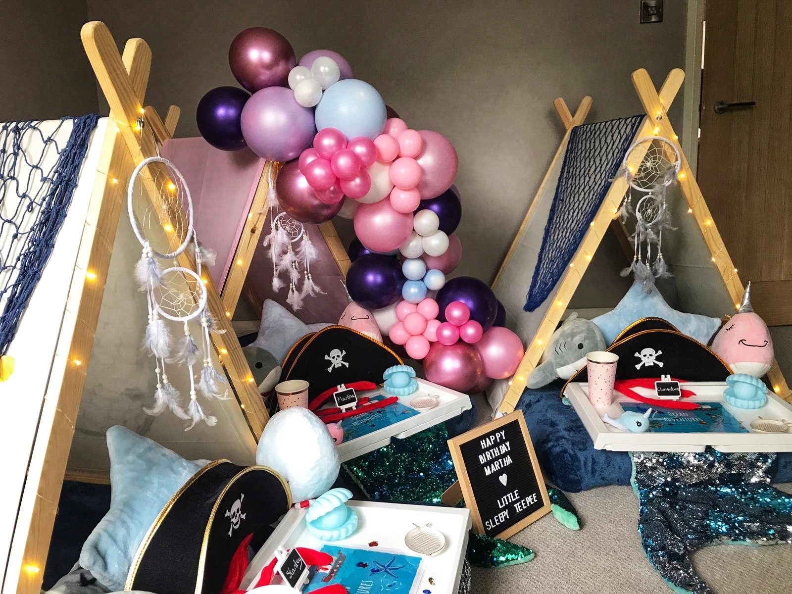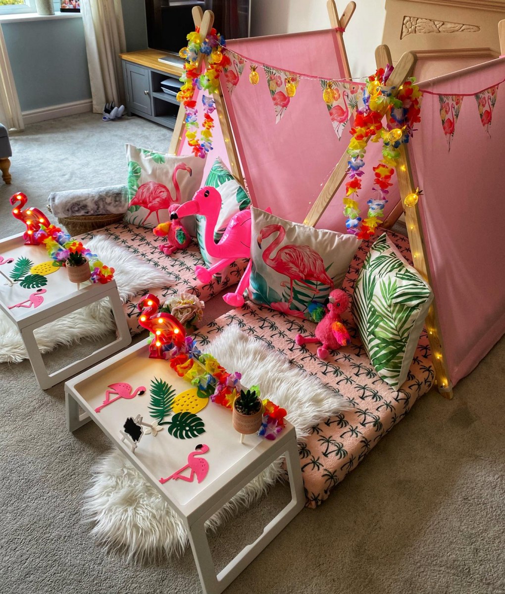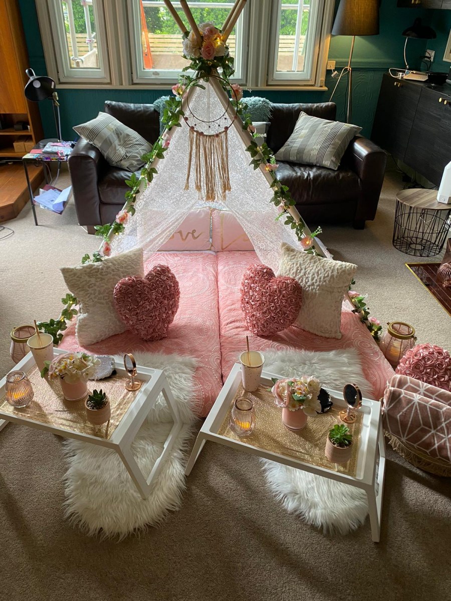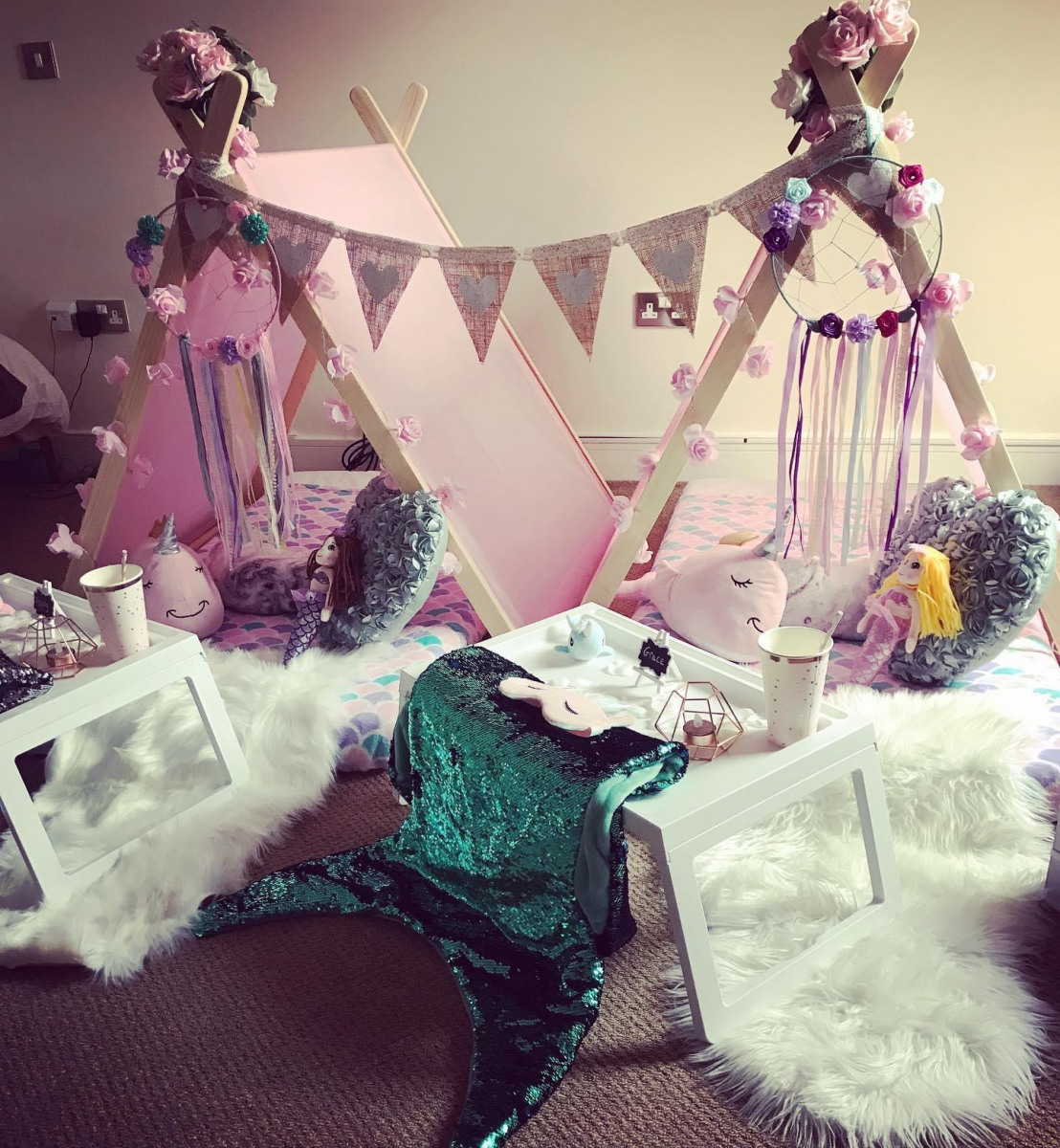 On this page you will find a selection of photos from some of our magical slumber party set-ups (The Grand Deluxe Double Lace Teepee; Tropical Flamingo; Game On!; Soccer Slumber; Glitz and Glamour; Movie Magic; Roarsome Dinosaurs; Treasures of the Sea; Ocean Adventures; Christmas Candy Cane; The Spa at Sleepy Teepee), click on any photograph for a larger image. We have also included a few videos to give you an idea of our magical set-ups. If you cannot see a theme that suits your needs, drop us a message and we will help to design a personal sleepover setup for you. All of our special themes are also available for play dates. Perfect for those who would prefer a party during the day or for children who are not quite old enough for a sleepover.