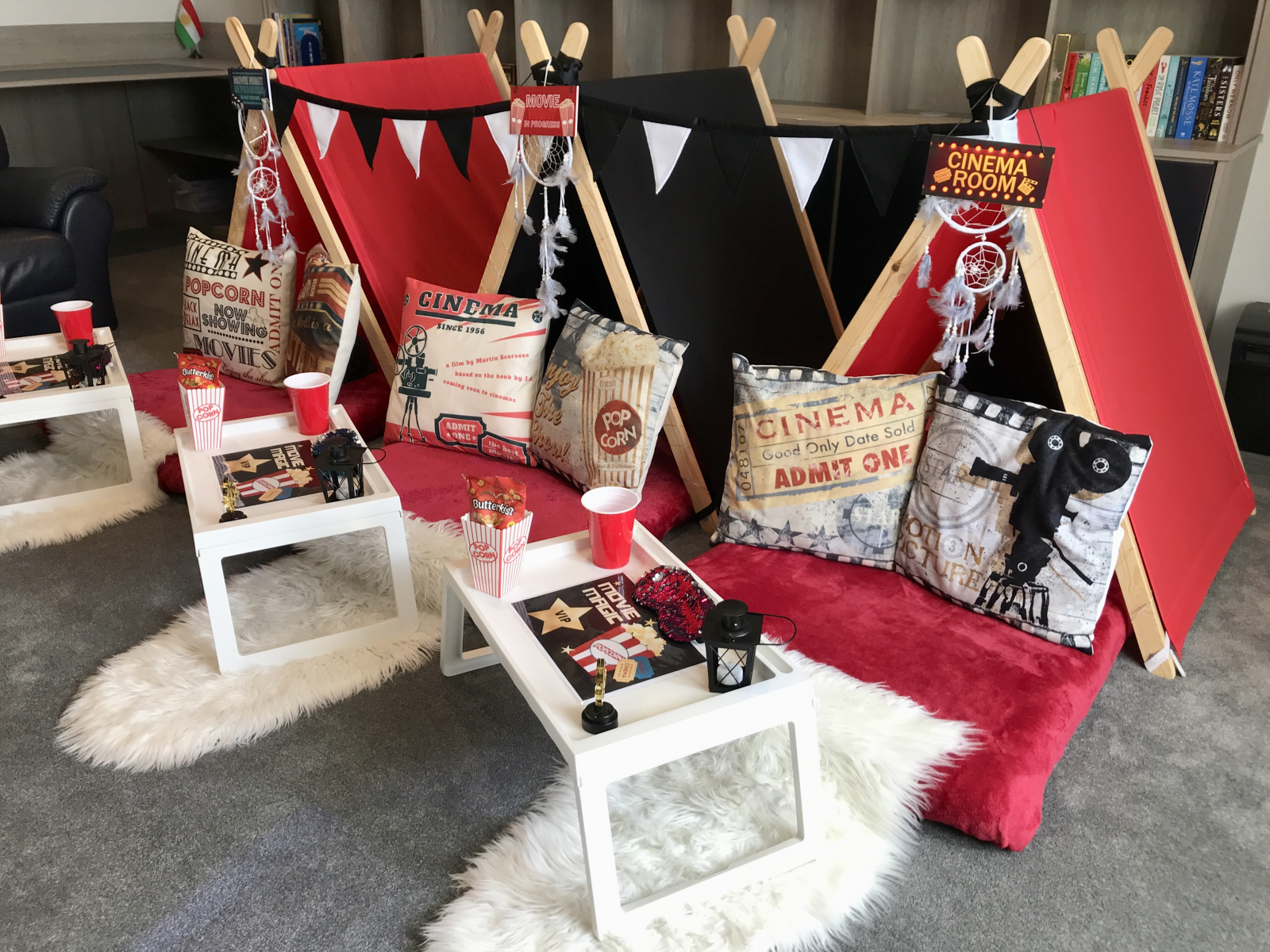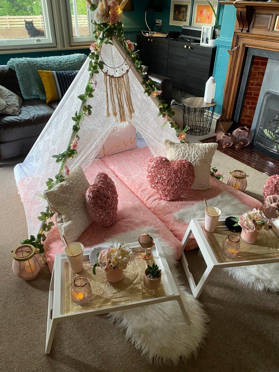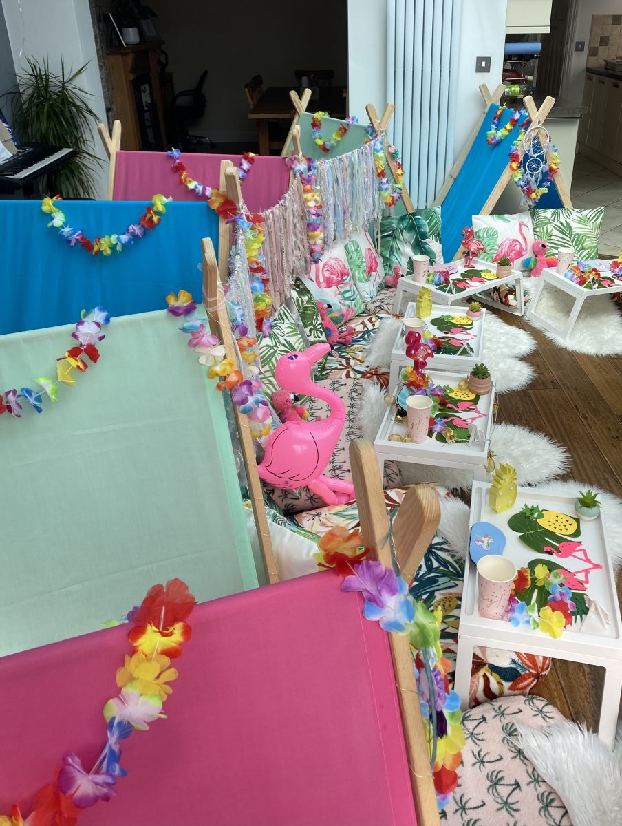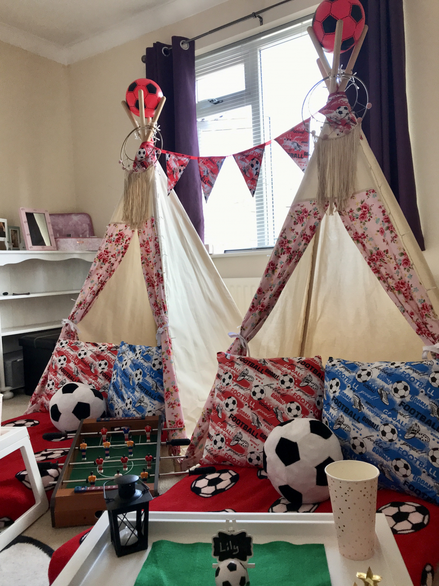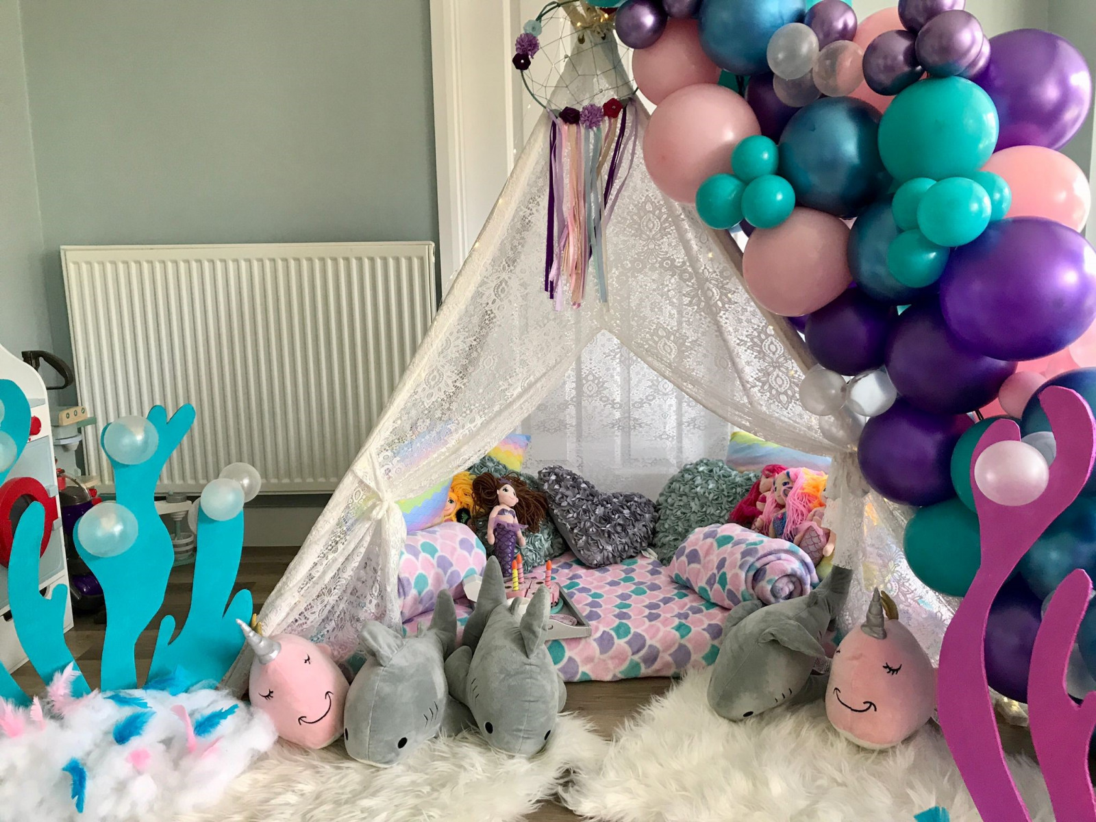 On this page you will find a selection of photos from some of our magical slumber party set-ups (The Grand Deluxe Double Lace Teepee; Tropical Flamingo; Game On!; Soccer Slumber; Glitz and Glamour; Movie Magic; Roarsome Dinosaurs; Treasures of the Sea; Ocean Adventures; Christmas Candy Cane; The Spa at Sleepy Teepee), click on any photograph for a larger image. We have also included a few videos to give you an idea of our magical set-ups. If you cannot see a theme that suits your needs, drop us a message and we will help to design a personal sleepover setup for you. All of our special themes are also available for play dates. Perfect for those who would prefer a party during the day or for children who are not quite old enough for a sleepover.