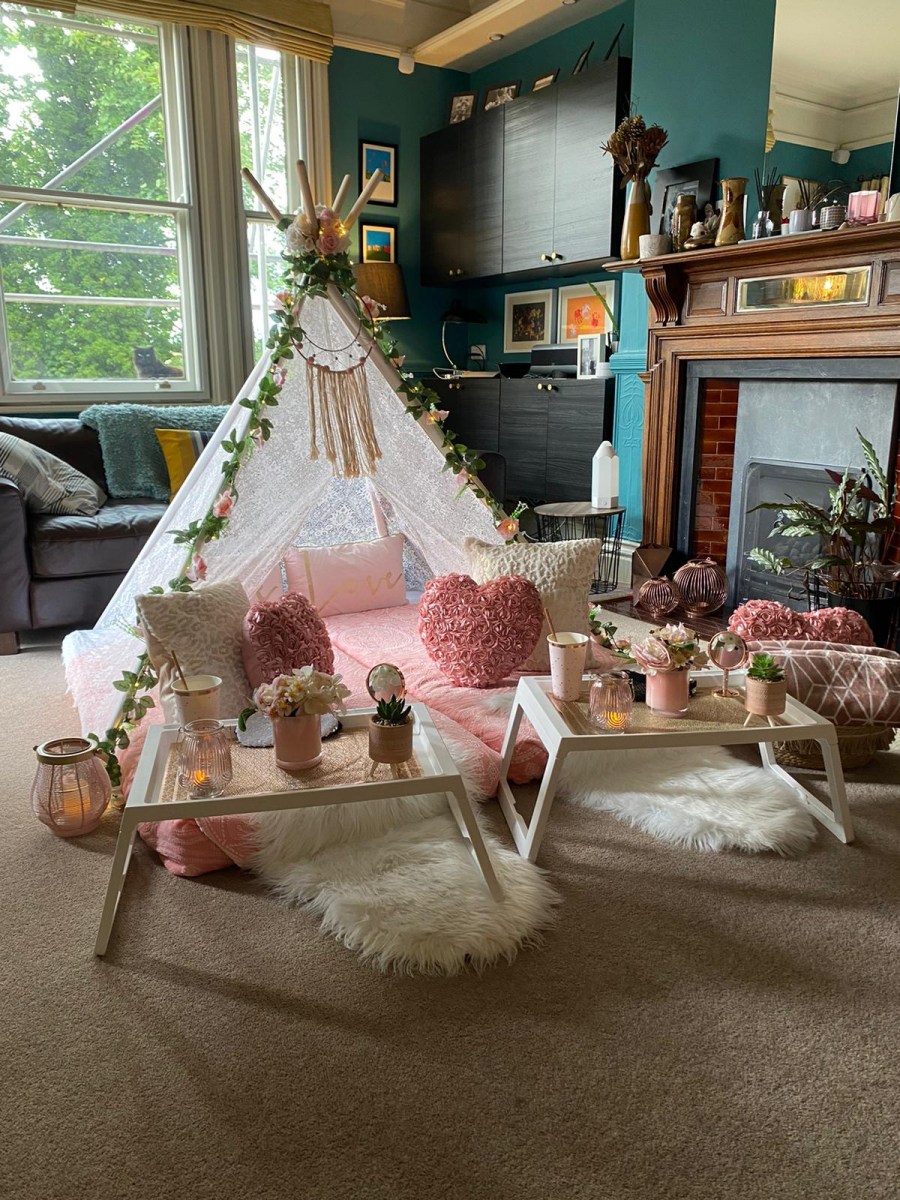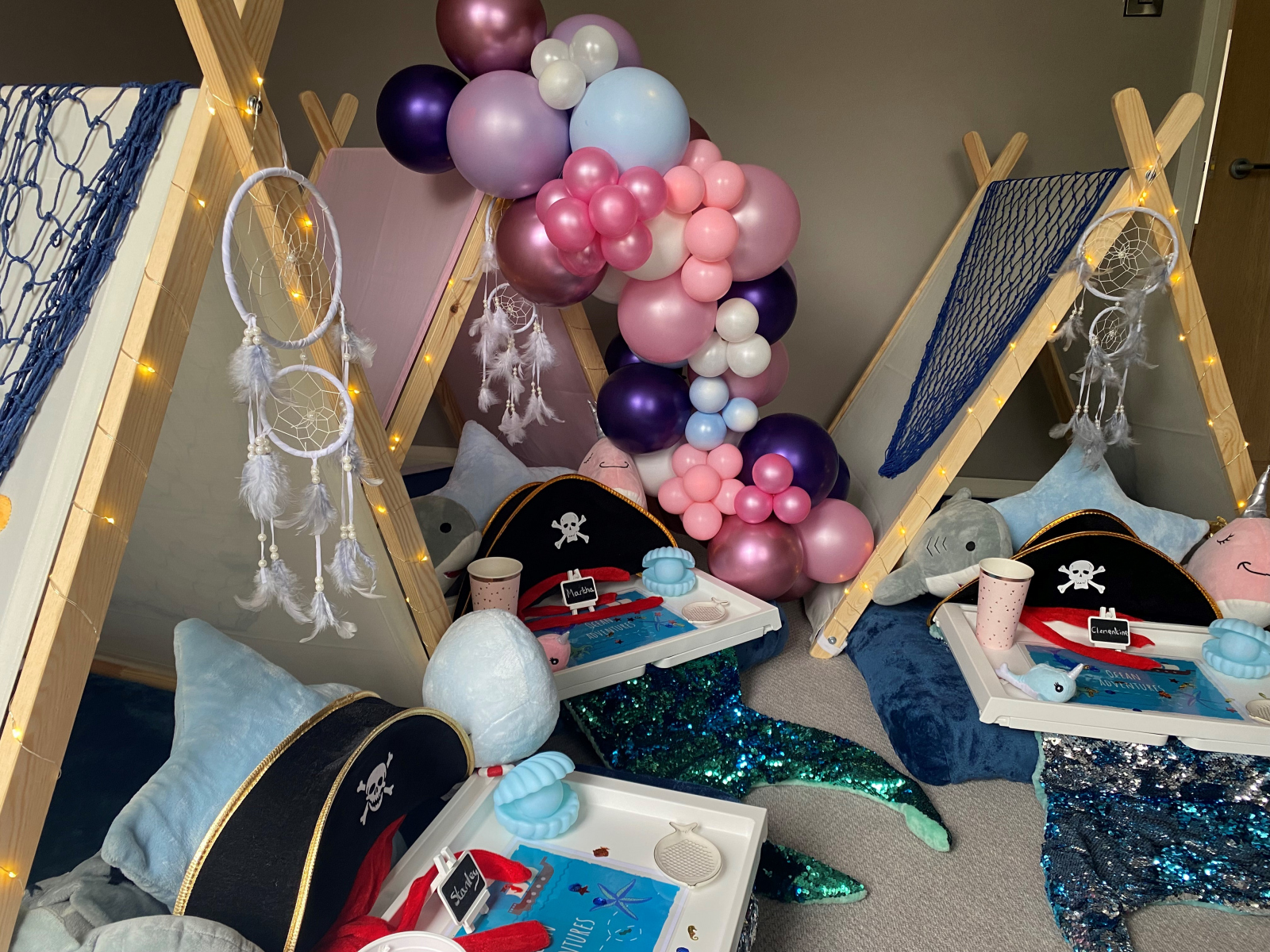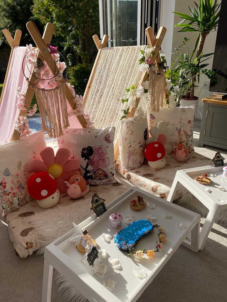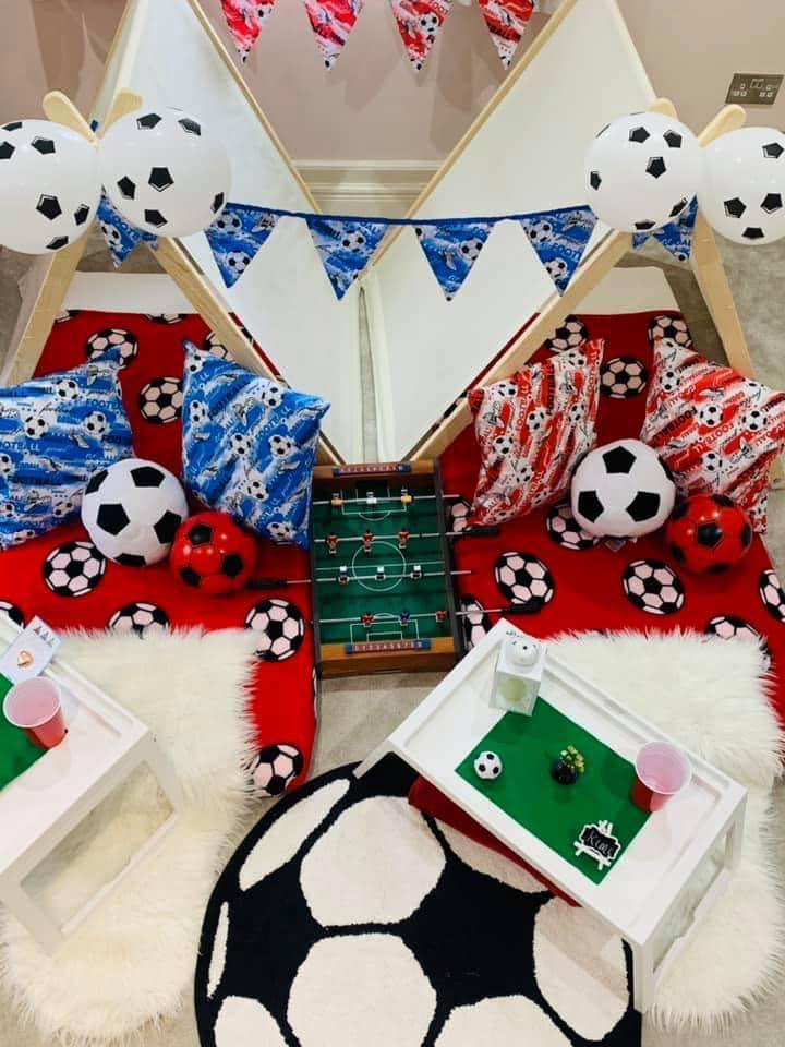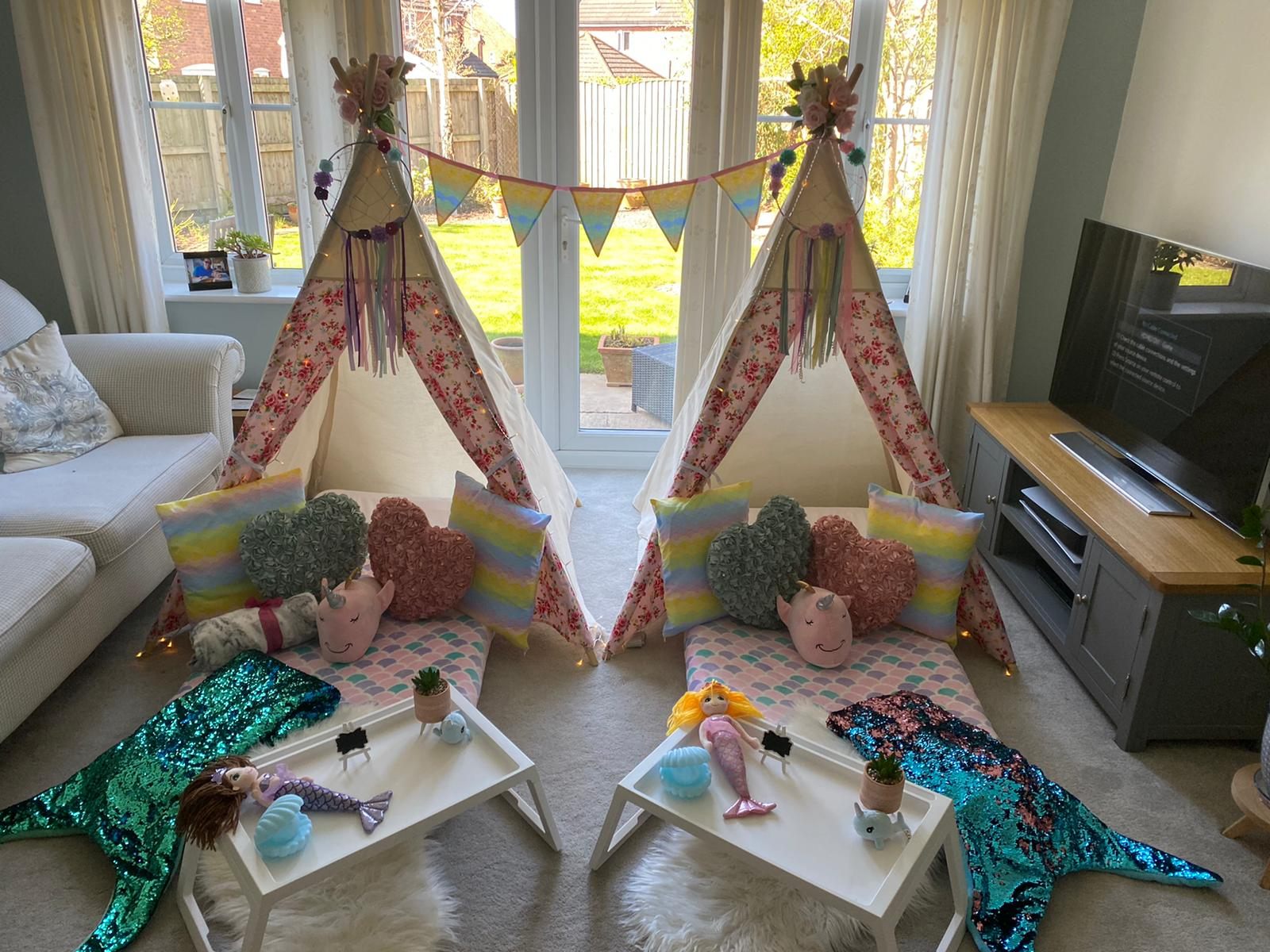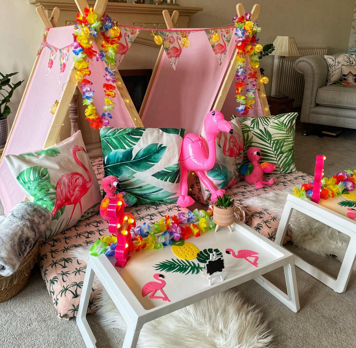 On this page you will find a selection of photos from some of our magical slumber party set-ups (The Grand Deluxe Double Lace Teepee; Tropical Flamingo; Game On!; Soccer Slumber; Glitz and Glamour; Movie Magic; Roarsome Dinosaurs; Treasures of the Sea; Ocean Adventures; Christmas Candy Cane; The Spa at Sleepy Teepee), click on any photograph for a larger image. We have also included a few videos to give you an idea of our magical set-ups. If you cannot see a theme that suits your needs, drop us a message and we will help to design a personal sleepover setup for you. All of our special themes are also available for play dates. Perfect for those who would prefer a party during the day or for children who are not quite old enough for a sleepover.